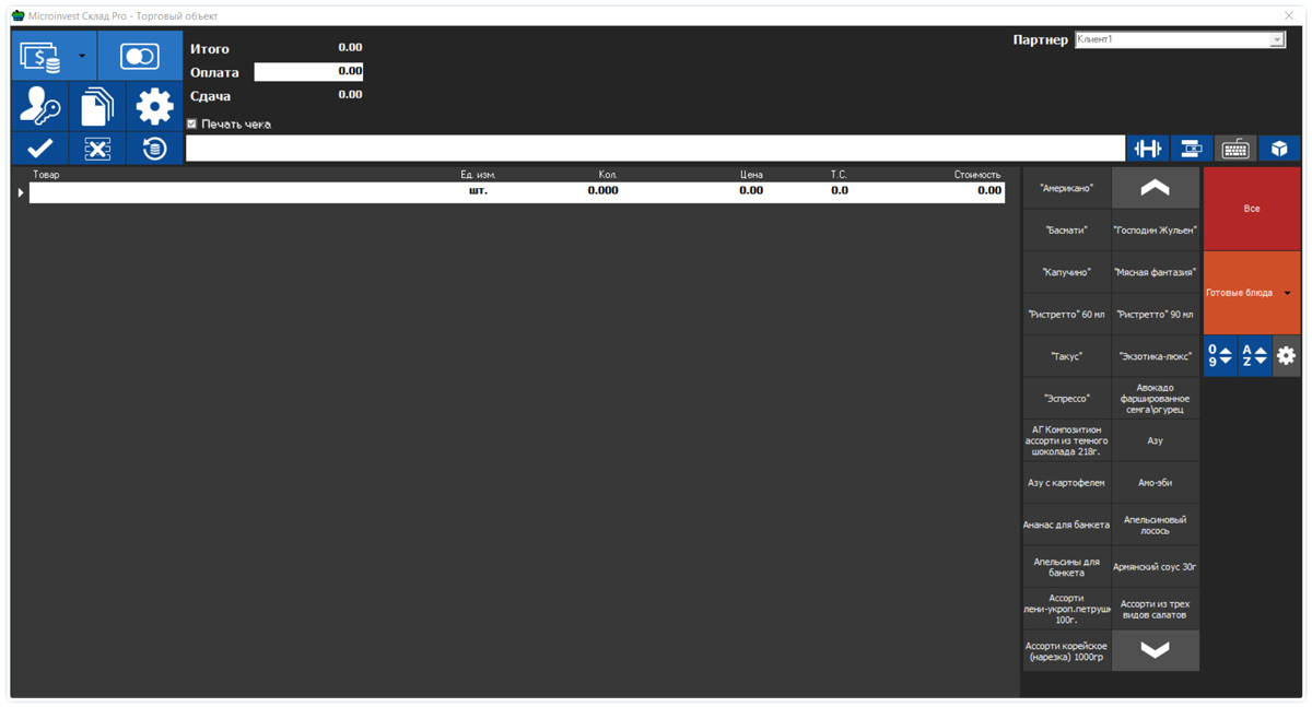 • Быстрый выбор товаров по горячим кнопкам, коду, штрих коду;