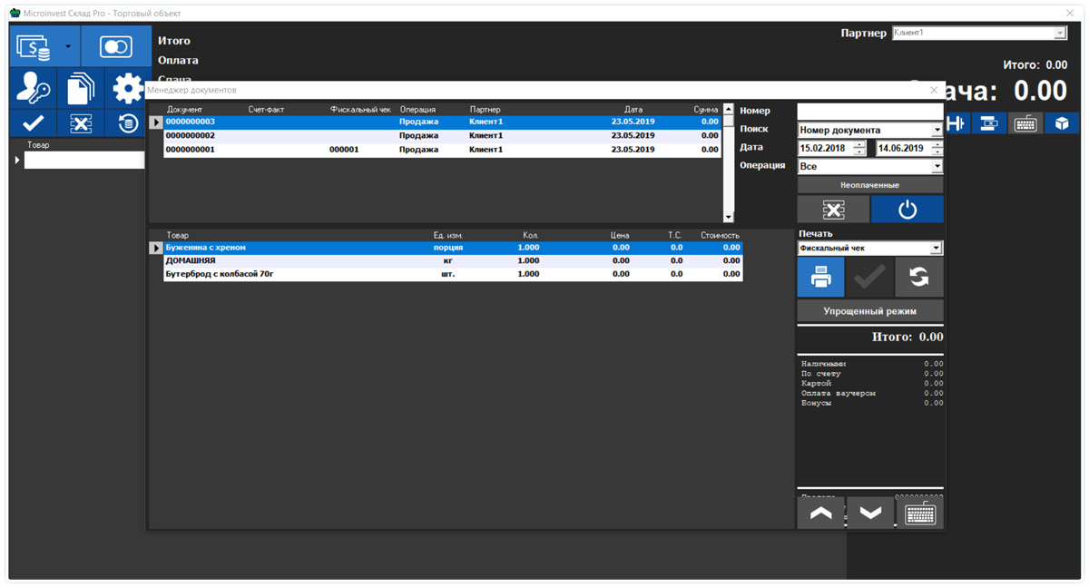 • Возможность откладывать сохраненный чек и товары в прикассовой зоне;