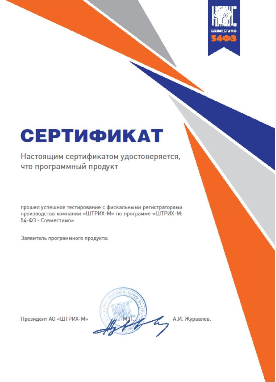 • Имеет сертификат совместимости со всеми ФР от компании "Штрих-М" в рамках программы 54-ФЗ.