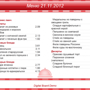 - Разносторонность применения. Если запустить Digital Board на планшетник – приложение будет работать, как Microinvest eMenu Pro. Если запустите его на большой экран – у вас уже готова реклама над кассой. Также можно запустить презентацию и в виде интернет-сайта. Все в Ваших руках!